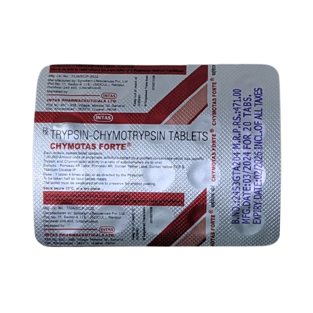 The product is manufactured by intas and the composition consists of Trypsin-Chymotrypsin 100000 AU and this product is a generic alternative for CHYMORAL FORTE TAB, LYMED FORTE TAB, ENZOFLAM CT, KYMOCIN FORT, CHYMTRAL FORTE, CHYMORAL PLUS, CHYMORAL AP, CHYMOTRYPSIN FORTE, CHYMOTRYPSIN, ZYMOGEN FORTE, CHYMOFEN FORTE, DICOL FORTE.