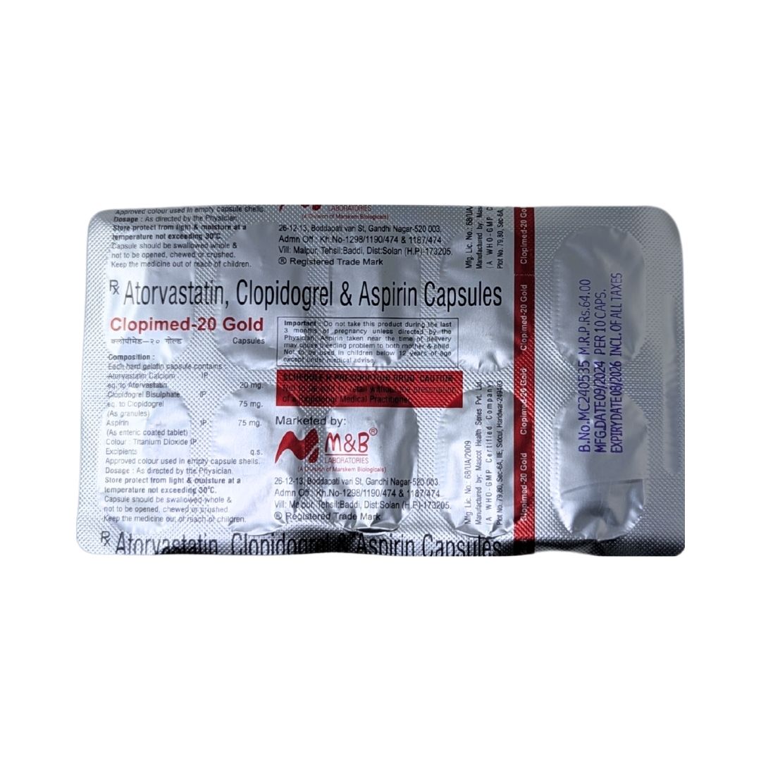 The product is manufactured by MASC and the composition consists of ATORVASTATIN 20MG + CLOPIDOGREL 75MG + ASPIRIN 75MG and this product is a generic alternative for Clopitab-CV Gold 20 Cap, Atorlip Gold 20 Cap, Lipikind-Plus 20 Cap, Atormac Gold 20 Ca, ATORVA GOLD 20MG CAP, Clopilet A 150, Rosuvas CV 20, Aspisure-Gold 20, Clopigold A 150, Roseday Gold 20.