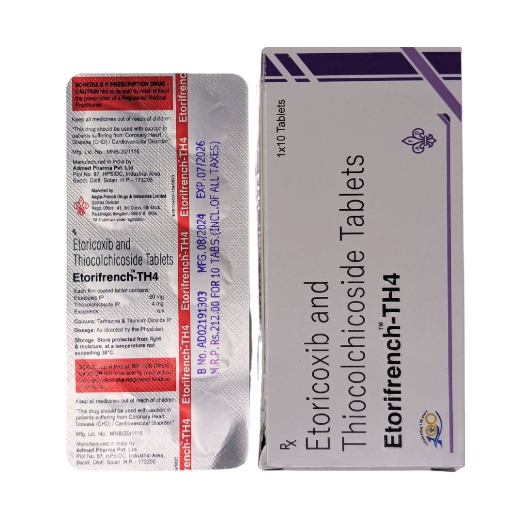 The product is manufactured by SYN and the composition consists of ETODOLAC+THIPCOLCHICOSIDE and this product is a generic alternative for ETORIC TH 4MG TAB, ABETOROX TH 4MG TAB, ETOSHINE MR TAB, RETOZ MR 4MG TAB, ETODY TH 4MG TAB, ETORIN-TH 4MG, NUCOXIA MR 4MG, ETORIK MR 4MG, ETORLIN MR 4MG, ETORICA-MR 4MG.