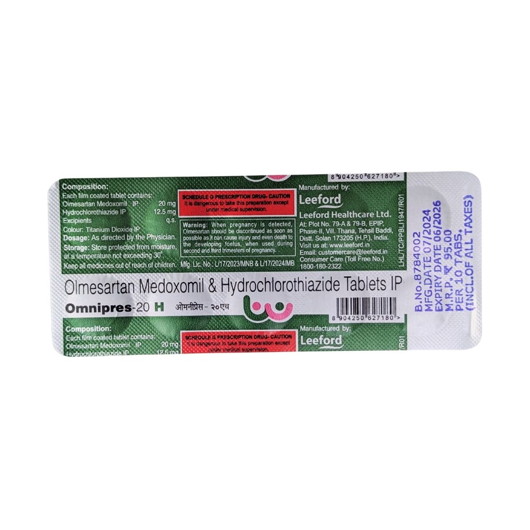 The product is manufactured by Leeford Healthcare Ltd. and the composition consists of Olmesartan Medoxomil 20 mg + Hydrochlorothiazide 12.5 mg